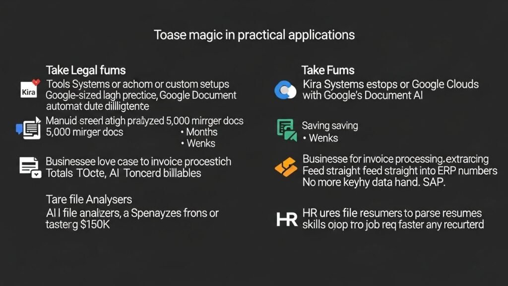 The real magic shines in practical applications. Take legal firms: Tools like those from Kira Systems or custom setups with Google Cloud’s Document AI automate due diligence. In one case I advised on, a mid-sized law practice analyzed 5,000 merger docs. Manual review? Months.